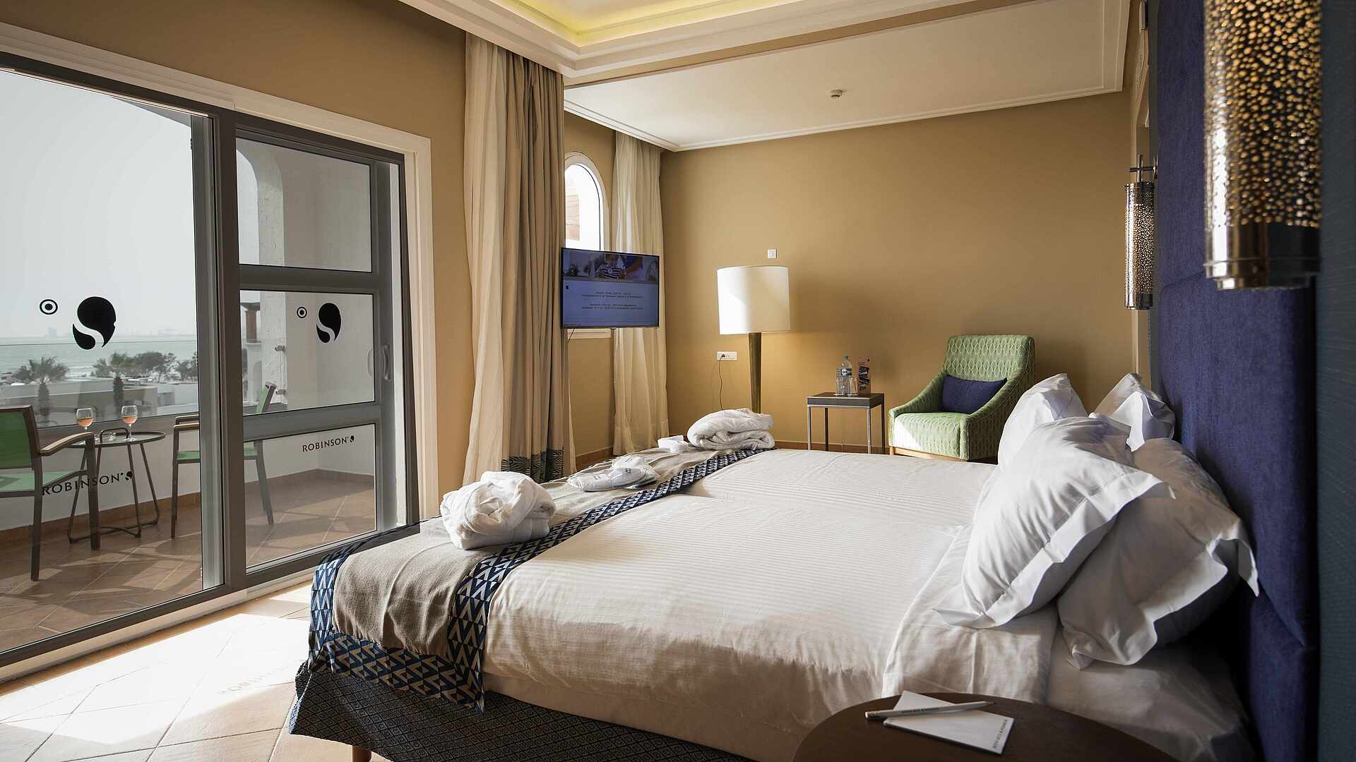 Die Zimmer im ROBINSON AGADIR sind am Anreisetag ab 15:00 Uhr bezugsfertig. Bitte beim Einchecken an der Rezeption die Ausweise (inklusive die Ausweise der Kinder) bereithalten. Am Abreisetag erfolgt der Check-out bis 11:00 Uhr. Nach Verfügbarkeit und in Absprache mit der Rezeption kann ein Late Check-out gegen eine Gebühr von 55 € bis 15:00 Uhr oder von 90 € ab 15:00 Uhr gebucht werden.