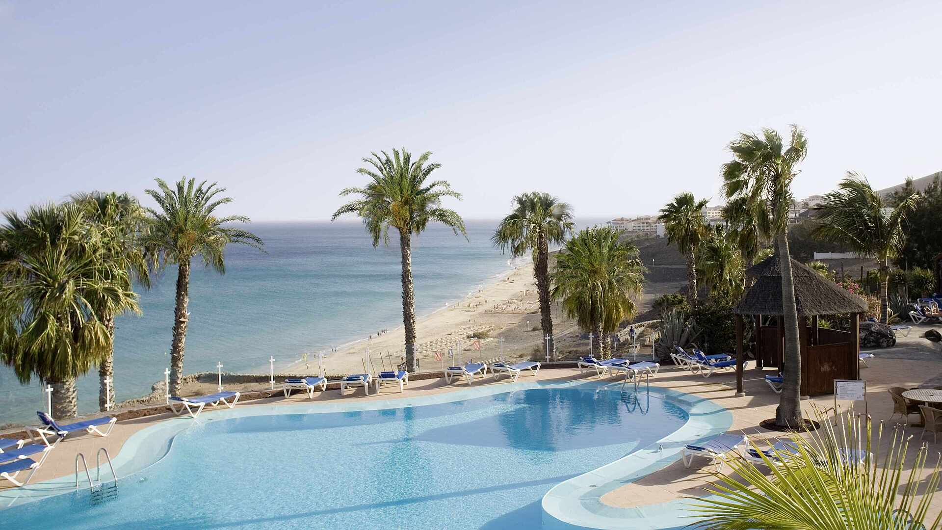 40 m über dem türkisblauen Meer, am goldgelben, scheinbar endlosen Sandstrand der Südostküste Fuerteventuras, liegt das 100.000 qm große Clubgründstück mit Garten, Palmen und Blüten. Ein befestigter Weg führt direkt zum öffentlichen Strand. Die Strandbreite ändert sich täglich und ist gezeitenabhängig.