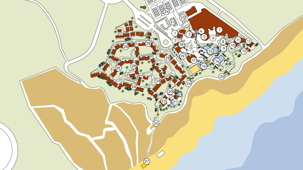 - Direkter, befestigter Weg vom Club zum Strand (Liegen und Sonnenschirme am öffentlichen Strand gegen Gebühr)