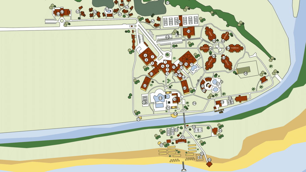 - Wohnblöcke: Haupthaus (DZX2, DZX4, DSX2, DZE1, FZX2, FZX3, SUX1, SUM1), Village (Augustus, Caesar, Antonius, Pompeius, Brutus und Septimus: DZX1, DSX1, DZE1, FZX1), Bungalows/Villen (BUX1, BUX2)