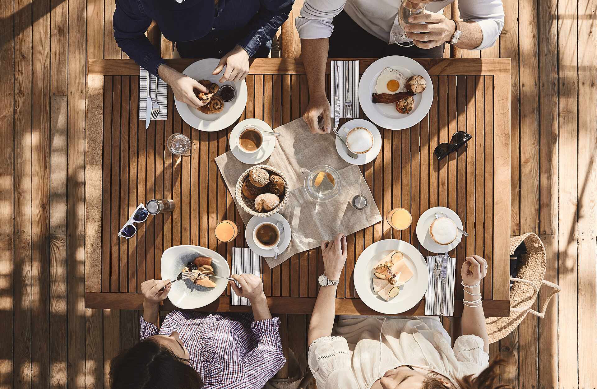 - Frühstück: Kaffeespezialitäten, Filterkaffee, Tee, Wasser, verschiedene Säfte