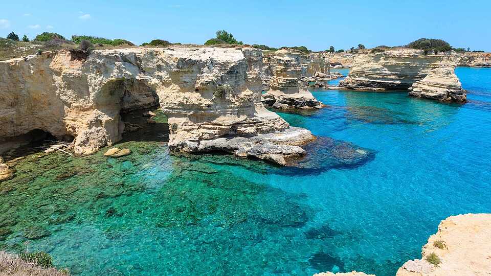 Tief im Süden hingegen liegt das Salento, ein Mekka für Sonnenanbeter, Wassersportler, Kulturliebhaber und Feinschmecker. Zu den schönsten Städten des Absatzes gehören die aus weißem Tuffstein errichtete Barockstadt Lecce und das mittelalterliche Otranto.