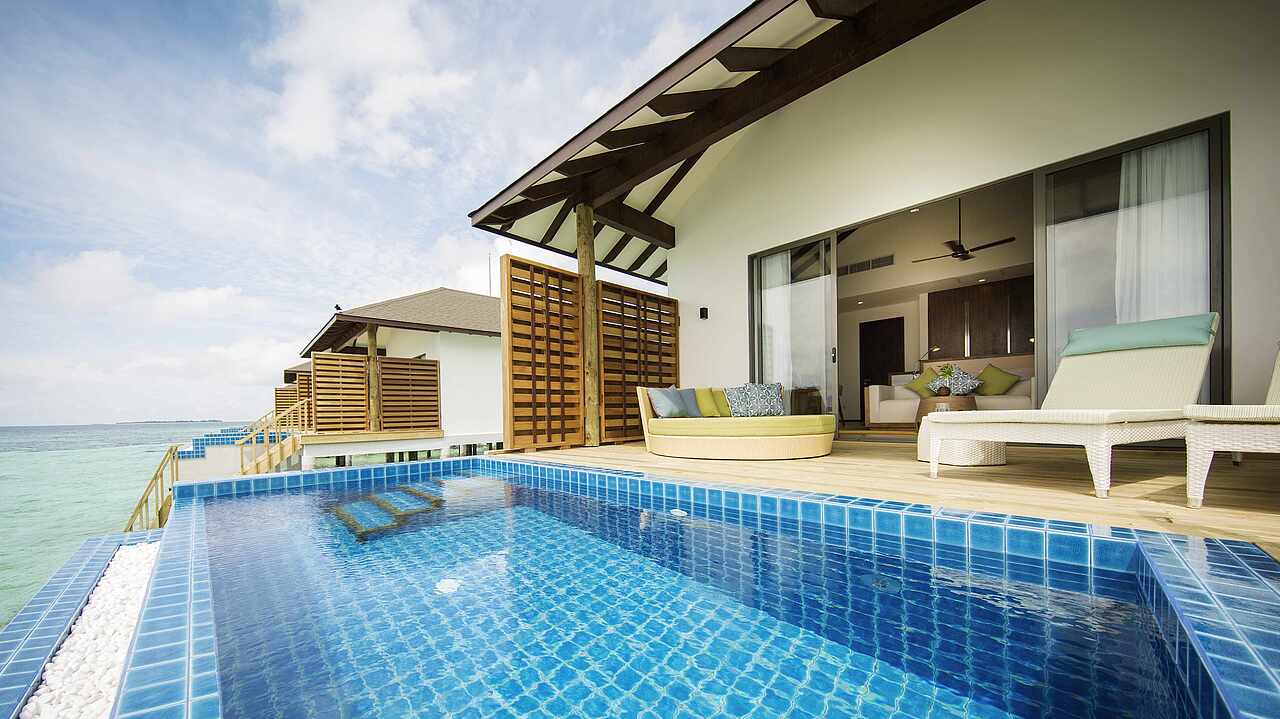 - Transfer: ab/bis Male mit einem Inlandsflug nach Maafaru ca. 35 Minuten und dann mit dem Speedboot weitere 30 Minuten oder gegen Aufpreis mit dem Wasserflugzeug ca. 45 Minuten