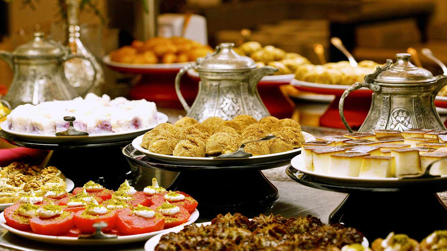 Die türkische Küche ist bekannt für ihre Vielfalt und ihre frischen Zutaten. Sie vereint Einflüsse aus dem Orient und dem Mittelmeerraum. Typisch sind herzhafte Gerichte mit viel Gemüse, Hülsenfrüchten, Reis und Brot. Gewürze wie Kreuzkümmel, Paprika und Minze verleihen den Speisen ein intensives Aroma. Vorspeisen wie Hummus, gefüllte Weinblätter und Börek machen den kulinarischen Auftakt. Weiter geht es mit frischem Fisch, Meeresfrüchten, gegrilltem Fleisch, Köfte und Pide. Dazu trinkst du das erfrischende Joghurtgetränk Ayran. Ein süßer Abschluss ist das verführerische Baklava begleitet von einem türkischen Mokka.