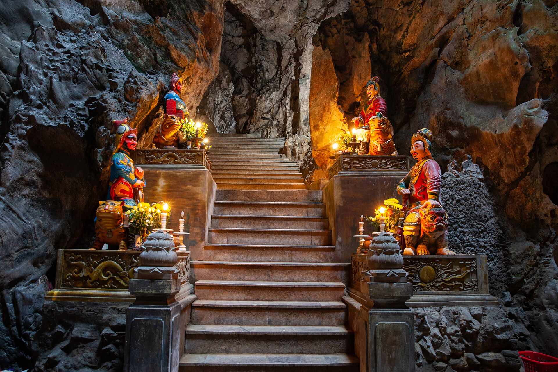 Dann schlendert ihr langsam weiter durch den malerischen Blumengarten Le Jardin D'Amour mit seinen unzähligen Farben. Der ideale Foto-Spot, denn auf euch warten umwerfende Blumenpracht und farbenfrohe Tierwelten. Bei der nächsten Station der Tour erlebt ihr die atemberaubende 150 Meter lange Golden Bridge, die von riesigen, moosbedeckten Händen gehalten wird und euch einen unbeschreiblichen Panoramablick auf die Hügel schenkt. Anschließend setzen wir unsere Reise gemeinsam zu den Marble Mountains fort, einer Ansammlung von Marmor- und Kalksteinhügeln, die nach den fünf Elementen benannt sind: Erde, Feuer, Wasser, Metall und Holz. In dieser malerischen Kulisse erkundet ihr die historischen Höhlen in den Bergen, die während des Vietnamkriegs einst als Tempel, Schlachtfelder und Krankenhäuser genutzt wurden.