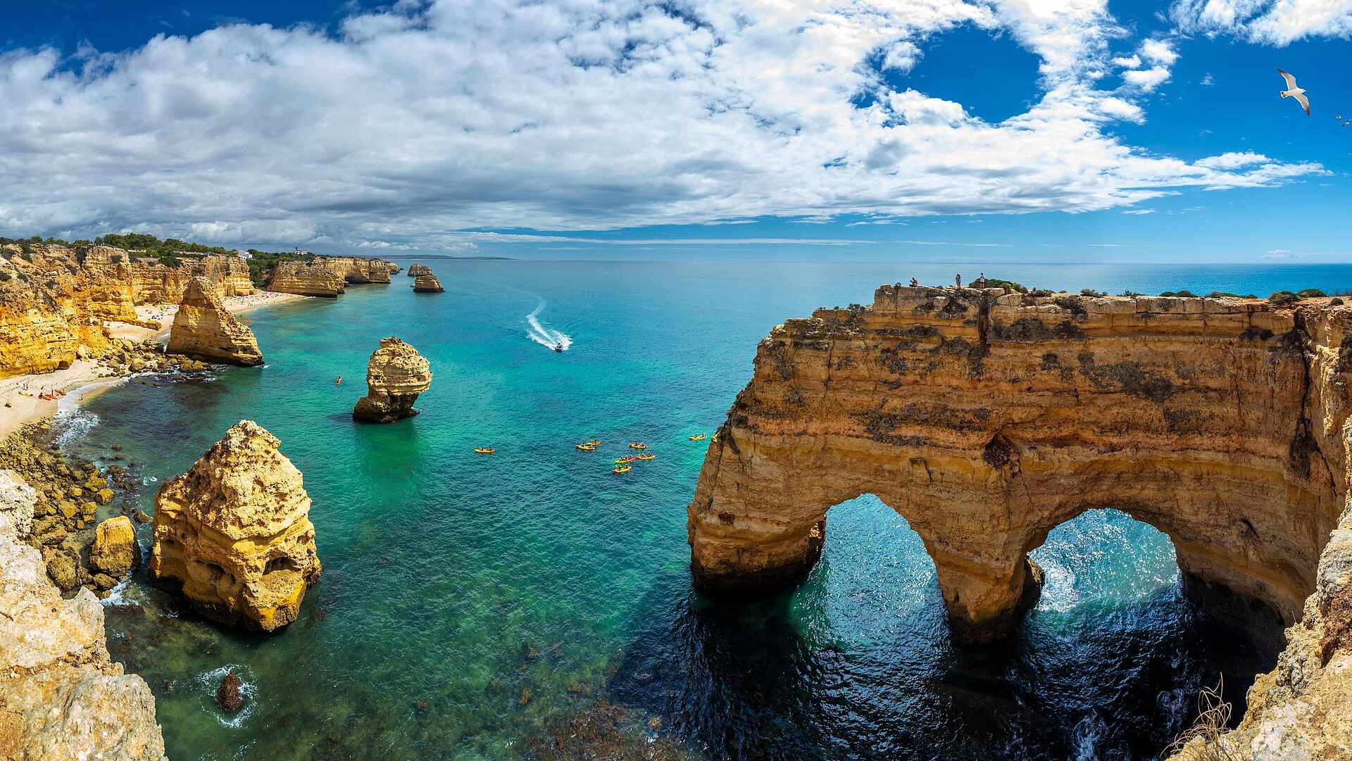 A costa do Algarve é caracterizada por íngremes recifes rochosos e imponentes formações rochosas. Ao longo dos anos, as ondas formaram grandes arcos rochosos com pequenas extensões de areia fina e água cristalina. Uma paisagem natural única espera por ti no interior, o que faz do Algarve um paraíso para turistas ativos . Quer seja golfe, equitação, caminhadas ou ciclismo - um resort de férias no Algarve tem muito para oferecer.