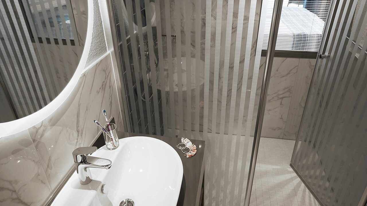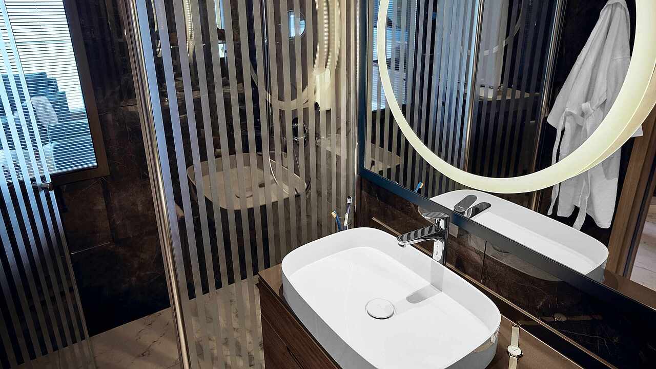 - Hizmet paketi ile 4 lüks şezlong, 2x2m yatak, teras, 2 şemsiyeli şezlong, kasa, vantilatör, buzdolabı ve özel duş
